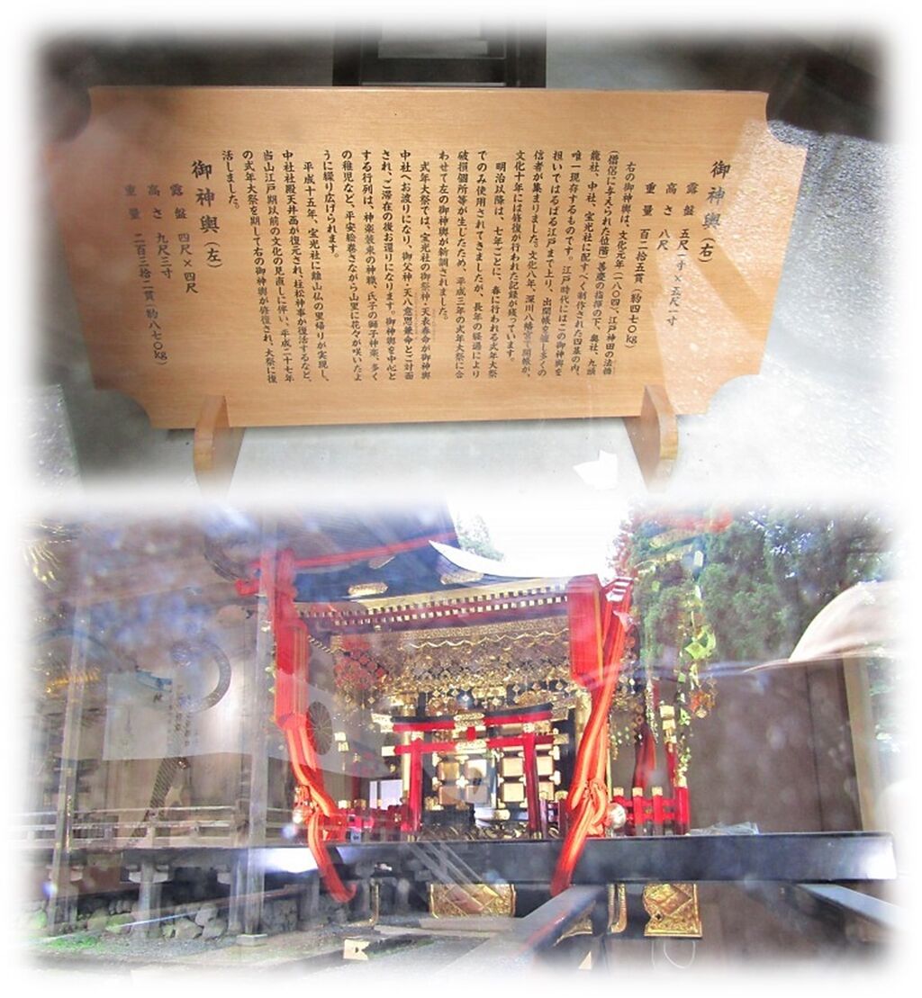 ガラス張りの神輿庫、内部に置かれた解説と、右の神輿を撮ってみた。