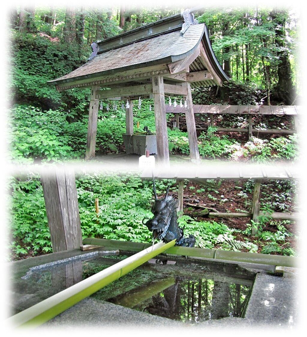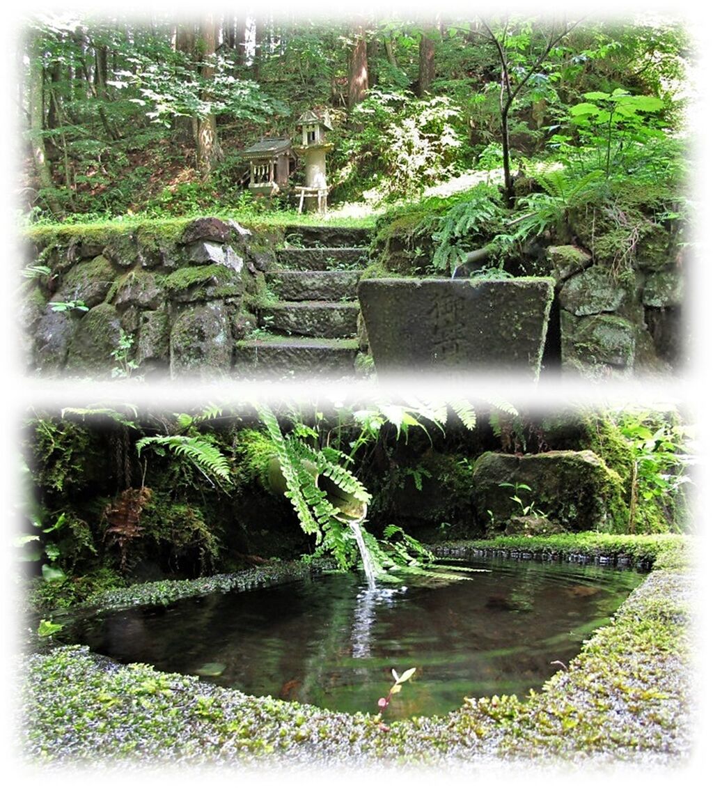 女坂沿いには苔むした手水鉢置かれ、山から湧き出た清水が鉢に注がれていました。