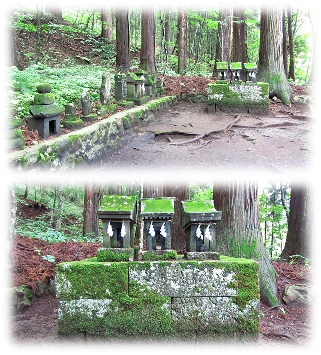 石段を上がると傾斜地を切り開いた社地が広がり、そこには見えていた三社以外にも複数の石の社と石仏が安置されています。