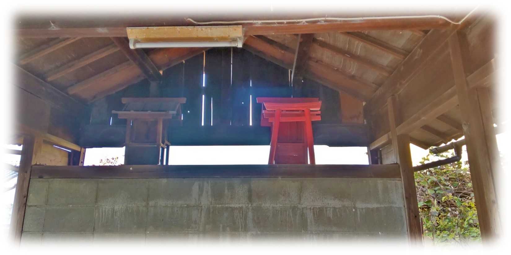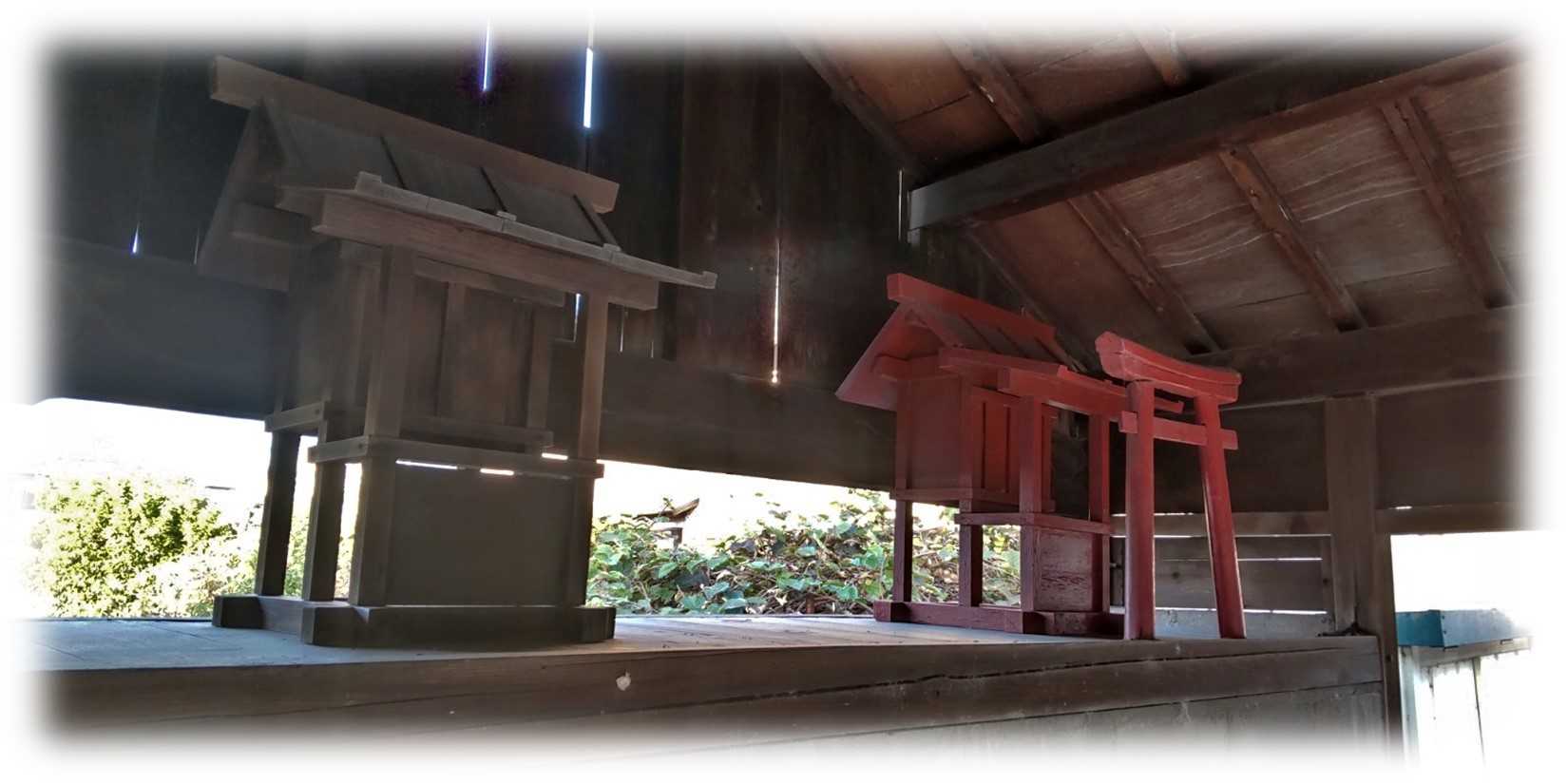 壁だと思っていたいたのは実は社の台座、その上に真赤な社と素木の社の二社が祀られていました。
